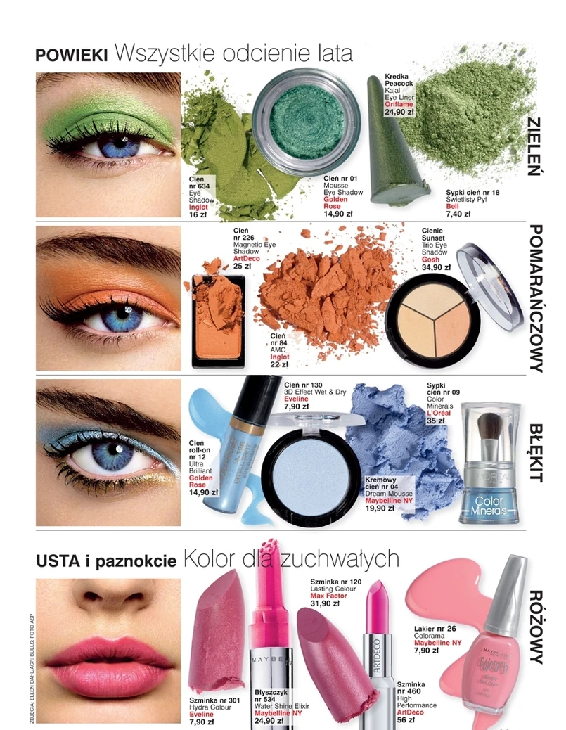 1. Cienie do powiek Tropicana Collection bazują na kolorystyce egzotycznej przyrody. Ich intensywność i świeżość idealnie wpisuje się w najnowsze trendy - szalone, eksplodujące kolorem, stanowią doskonałe narzędzie do kreowania fantazyjnych makijaży. Rozświetlające drobinki nadają lekkości kolorom, a delikatna pudrowa konsystencja cieni gwarantuje precyzyjną aplikację oraz trwałość przez cały dzień, Bell, 4,75 zł