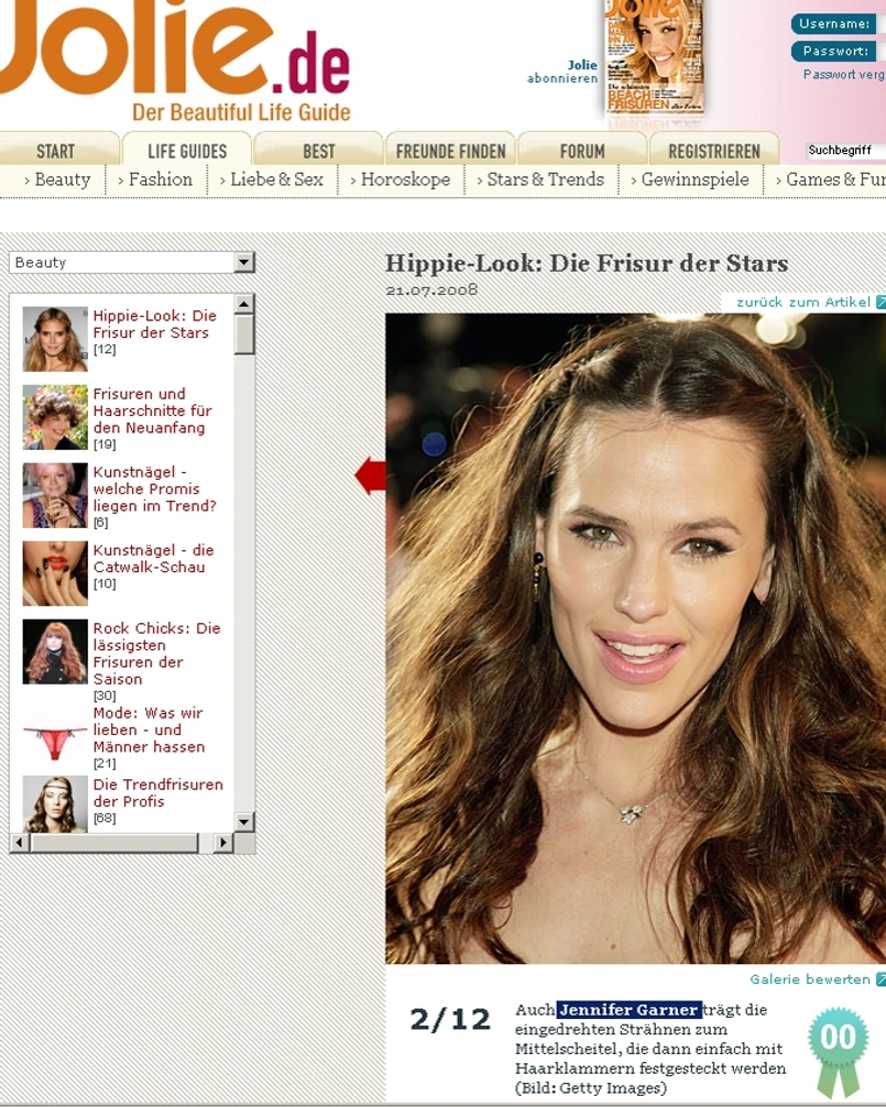Włosy ułożone wiatrem i usztywnione pianką, a grzywka (duża) i zebrana do tyłu to najmodniejsza w tym sezonie odmiana stylu hippie. Świetnie czują się w niej Mary Kate-Olsen iJennifer Garner.