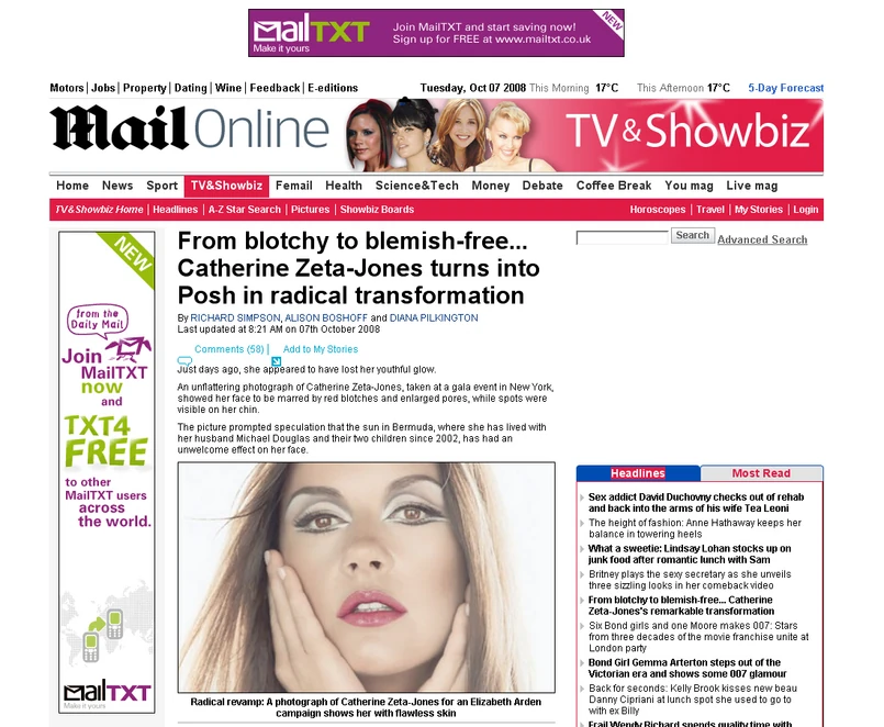 Do zdjęcia numer jeden brytyjska aktorka Catherine Zeta-Jones pozuje fotoreporterom na eleganckim przyjęciu w Nowym Jorku, na które przyszła wraz ze swym mężem Michaelem Douglasem. Jej makijaż jest taki, jaki zazwyczaj robi, szykując się na przyjęcia - na tyle słaby, że nie przykrywa szpetnych plam, krost i rozszerzonych porów ani rozległych przebarwień na policzkach. 39-letnia Zeta-Jones wygląda do tego stopnia źle, że dziennikarze bulwarówek rozpoczęli spekulacje, co się stało. Może to słońce Bermudów, na których aktorka mieszka z rodziną od sześciu lat, tak zniszczyło znaną z nieskazitelnego wyglądu skórę Catherine?