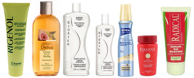 1. Rigenol, silnie działający krem do włosów zniszczonych, 2. Doliva Fiori di Sicilia, odżywka i szampon do włosów z filtrem UV, 25 zł; 3. Farouk, Fruit Coctail Reconstructing Shampoo, 42 zł.; 4. Nivea, pianka do stylizacji włosów z filtrem UV, 15 zł, 5. Kerastase, Kąpiel po słońcu, 79 zł; 6. Radical, serum do włosów zniszczonych, 12 zł.