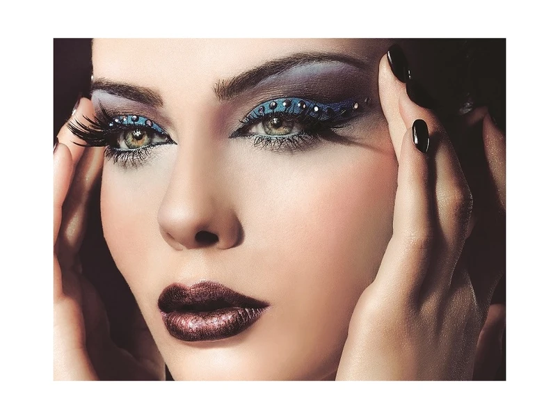 Wyrazistym elementem makijażu są również oczy. Bezkresny, metaliczny błękit wyciągnięty cieniem w kredce daleko poza obręb powieki, ujarzmiony został szlachetną czernią geometrycznej kreski. Jej drapieżne wykończenie w szpic w wewnętrznym kąciku oka oraz pretensjonalnie wytuszowane rzęsy tworzą mocną oprawę makijażu. Mroźny błękit rozpala ciepłym blaskiem złote pasmo cieni w kredce. Rozciąga się ono wzdłuż załamania powieki, by tuż pod łukiem brwiowym znów ustąpić miejsca zwiewnej, lazurowej smudze. Rozświetlona błękitem linia wodna dolnej powieki powiększa optycznie oczy, rozjaśnia spojrzenie i dodaje lekkości, którą równoważy mocne akcenty. Szyku całej stylizacji zadają maleńkie cyrkonie ułożone na ruchomej powiece w falę wymykającą się niemal ku skroni, co zjawiskowo wydłuża oczy i podkreśla ich koci kształt. Doskonale pasować będą do kolczastej biżuterii i ćwieków goszczących bezpruderyjnie niemal na wszystkich elementach garderoby.