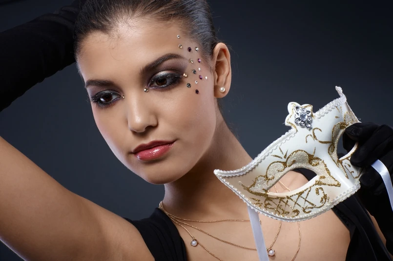 Idealne usta w sezonie karnawałowym są mocno podkreślone i błyszczą kryształowymi drobinkami. Wybierz błyszczyk, który nie tylko nawilży usta, ale tez optycznie je powiększy i nada fantastyczny połysk. Jeśli wolisz szminkę, pamiętaj, aby pierwszą warstwę koloru rozprowadzić od centralnej części ust w kierunku kącików, a także w stronę górnego brzegu ust. Aby zwiększyć trwałość makijażu, delikatnie odciśnij usta na chusteczce higienicznej, a następnie nałóż drugą warstwę koloru. Na zakończenie wyrównaj brzegi za pomocą korektora naniesionego specjalnym pędzelkiem i pudru do twarzy.