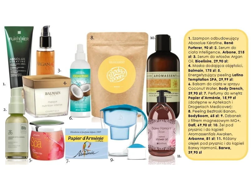 Perfumy do wnętrz Papier d’Arménie, 15,99 zł (dostępne w Aptekach i Drogeriach Medicover); Żel pod prysznic i do kąpieli Aromassentials Awaken, Arbonne, 81 zł; Różany olejek pod prysznic i do kąpieli Barwy Harmonii, Barwa, 39,90 zł; Energetyzujący peeling Latino Temptation SPA, 29,99 zł; Peeling Beztroski Banan, BodyBoom, 65 zł; Serum stymulujące do ciała Intelligence, Arbone, 215 zł; Balsam do ciała w sprayu Coconut Water, Body Drench, 39,90 zł; Dzbanek z filtrem magnezowym MG+, Dafi, 69,90 zł.