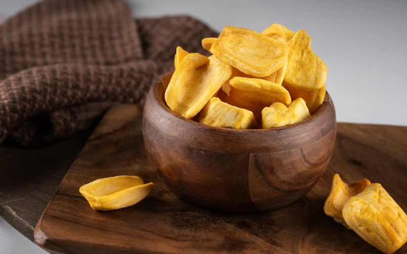 Suszony chlebowiec to zdrowa przekąska bogata w błonnik, witaminy (m.in. C, B6, A) i minerały (m.in. potas). Może być spożywany samodzielnie lub dodawany do musli, deserów, ciast czy sałatek.