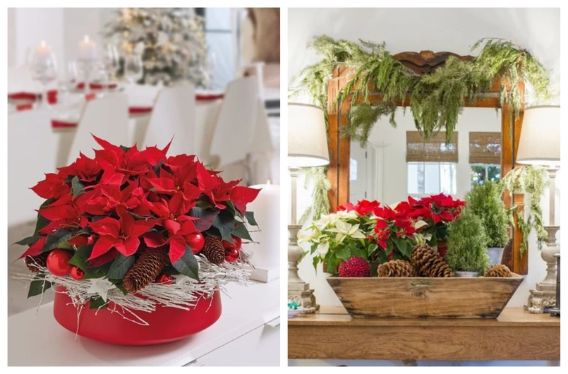 6. Miniaturowe poinsecje można włożyć w osłonki zrobione z lasek cynamonu czy metalowe wiaderka. Ułożyć na tacy i udekorować mchem i gwiazdkami anyżu.