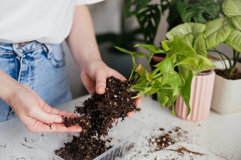 Biały osad na glebie może być również wynikiem obecności zarodników pleśni. Pleśń na glebie często jest wynikiem nadmiernej wilgoci i słabej cyrkulacji powietrza. W tym przypadku przepłukiwanie gleby nie jest dobrym rozwiązaniem. Dodatkowa woda raczej nasili problem pleśni, niż go usunie. Zamiast tego, ważne jest, aby kontrolować poziom wilgoci w glebie i zapewnić odpowiednią cyrkulację powietrza wokół roślin. Ponadto konieczne jest usunięcie zainfekowanej warstwy gleby i zastąpienie jej świeżą ziemią. Glebę usuwamy z wierzchu tak długo, aż pojawiają się na niej zarodniki pleśni. Czasami pleśń ustępuję dopiero wiosną. Można też rozważyć przesadzenie kwiatka i wymianę całej gleby, nawet w sezonie zimowym. Jeśli zdecydujesz się na przesadzanie, delikatnie otrzep korzenie rośliny i umyj doniczkę ciepłą wodą z dodatkiem płynu do mycia naczyń lub mydła. W ten sposób usuniesz ew. zarodniki pleśni.
