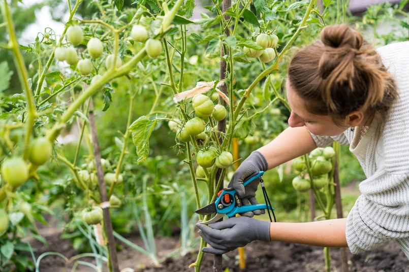 Czym najlepiej usuwać liście? Można to robić za pomocą dłoni lub sekatora. Zarówno dłonie, jak i narzędzie powinny być czyste. Pozwoli to uniknąć ryzyka przeniesienia choroby z innych roślin. Ważne, aby urwać cały liść, razem z ogonkiem u nasady. Jeśli pozostawimy jego część, fragment może gnić i tym samym osłabi pomidory.