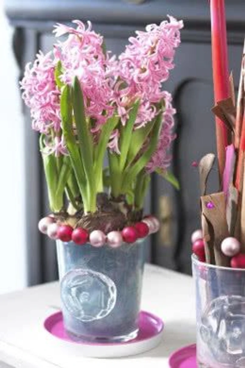 1/9 Kilka cebul hiacyntów zasadź w doniczce, wokół doniczki możesz zrobić dekorację z małych bombek. Modnym obecnie kolorem w aranżacjach świątecznych jest różowy i fuksja. Różowe hiacynty świetnie wyglądają z jasno i ciemnoróżowymi bombkami (fot.Pinterest.com)
