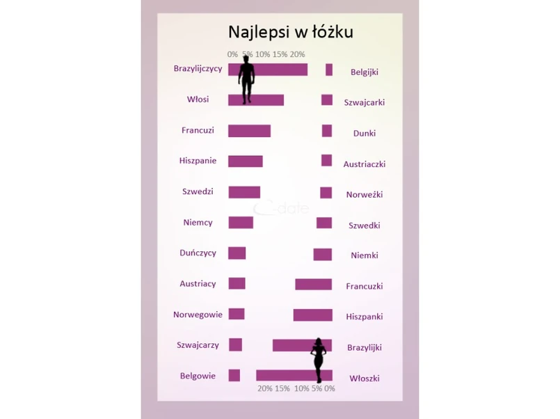 Hegemonię południowego temperamentu potwierdza niemal ¾ respondentów. Jedna osoba na cztery za najlepszych kochanków uznaje Brazylijczyka i Włoszkę. Niewiele mniej natomiast – Włocha i Brazylijkę. Zgodnie z wynikami ankiety C-date.pl Południe dystansuje Północ. Rozgrywka o trzecie i czwarte miejsce odbywa się w zamkniętym przez Francję i Hiszpanię gronie – płonne więc starania ambitnych: Szweda i Niemki.