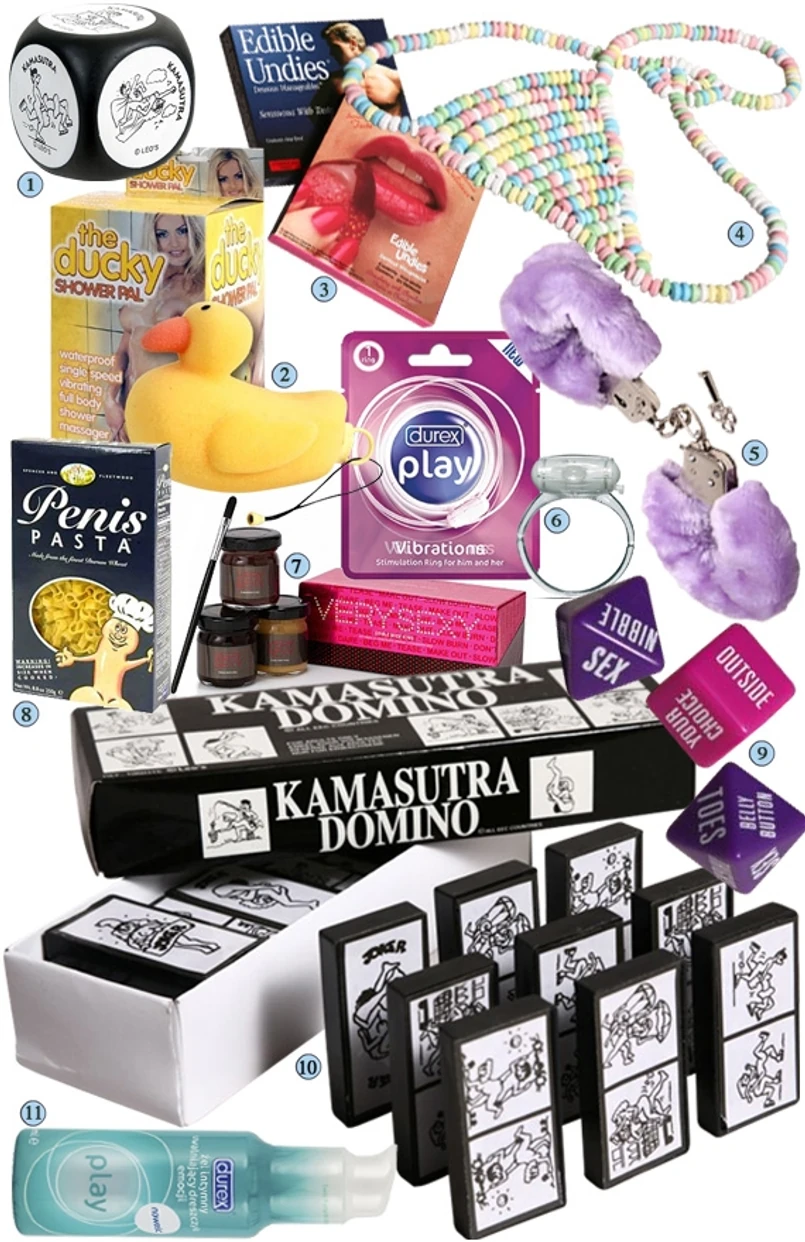 1. Pikantne kostki do gry, 39,90 zł; 2. Wibrująca kaczuszka wykonana z gąbki. Wbudowany wewnątrz wibrator jest wodoodporny. Idealna do igraszek w wannie lub pod prysznicem, 51 zł; 3. Jadalne majteczki, 49 zł; 4. Cukierkowe stringi, 47,90 zł, 5. Kajdanki z futerkiem, ok. 50 zł; 6. Nakładka zwięszająca rozkosz, wzór, 7. Farbki do ciała, ok. 60 zł; 8. Makaron w kształcie penisków..Uwaga powiększa sie podczas gotowania! 27 zł; 9. Kostki do gry Kamasutra, 16 zł; 10. Domino z Kamasutrą, 58,00 zł;11. Żel Durex z "dreszczykiem" - 17,99 zł
