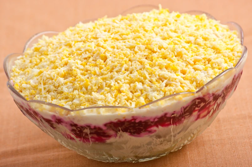 Ziemniaki, marchewki i buraka gotujemy w osolonej wodzie. Następnie wystudzone ścieramy na tarce o grubych oczkach. Cebulę kroimy w drobną kostkę, natomiast śledzie w grube paski. Na dnie naczynia układamy warstwami: rybę, cebulę, marchewki, ugotowane na twardo jajka, ziemniaki i buraka. Wierzch smarujemy warstwą majonezu połączonym ze śmietaną. Całość posypujemy po wierzchu żółtym serem startym na grubych oczkach.
