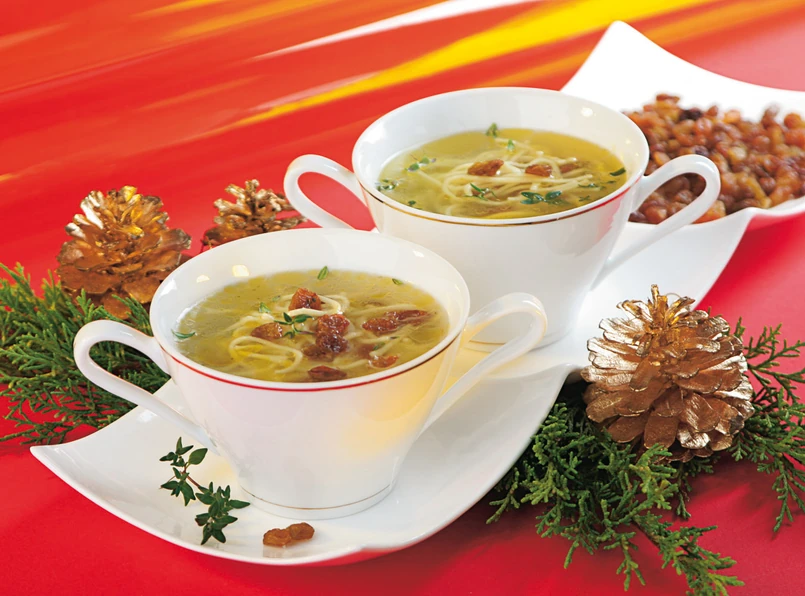 4 Składniki: 50 dag wołowiny bez kości; 50 dag kury rosołowej; włoszczyzna; łyżka rodzynek; sól; pieprz; świeży tymianek Wołowinę umyć, zalać 2,5 l zimnej wody, posolić i gotować na małym ogniu (wywar powinien tylko lekko "mrugać"). Pod koniec dodać kurę oraz umytą, oczyszczoną i obraną włoszczyznę. Gotować rosół, aż warzywa i mięso staną się dostatecznie miękkie. Mięso wyjąć (można je wykorzystać do innych celów), rosół przecedzić. Dodać do niego opłukane rodzynki i tymianek. Przyprawić do smaku solą oraz pieprzem. Podawać z makaronem.