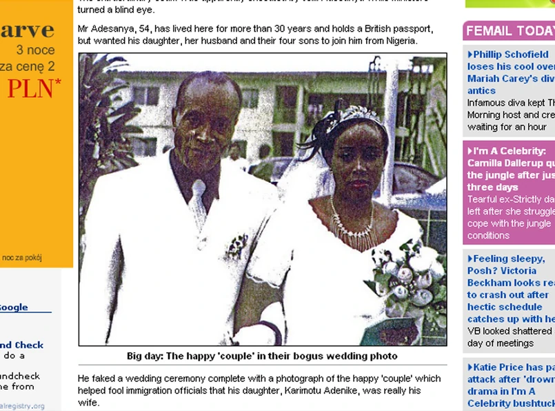 Ale nie chodzi o kazirodztwo ani żadne dziwne plemienne zwyczaje. Adesanya zdecydował się poślubić córkę, aby zapewnić jej brytyjską wizę - donosi brytyjski dziennik "Daily Mail". Sam mieszka na Wyspach od 30 lat i ma brytyjski paszport, tego szczęścia nie miała jednak jego nigeryjska córka wraz z mężem i czterema synami. Piękne fotografie ze ślubu miały przekonać urzędników migracyjnych, że Karimotu naprawdę jest jego prawowoią małżonką. Plan był więc prosty – i szatański, bowiem pracodawcą Karimotu jest właśnie… Home Office, biuro zajmujące się nadzorowaniem spraw migracyjnych, w tym podobnych oszustw. Uroczystość odbyła się w Nigerii w 2007 roku. Małżonkowie opłacili fałszywych gości ceremonii, tak, aby oszukać brytyjską komisję. Panna młoda otrzymała dwuletnią wizę. W paszporcie ma fałszywą datę urodzin – została postarzona o 10 lat, by nie budzić podejrzeń różnicą wieku. W oświadczeniach nie wspomniała o tym, że ma już męża i czworo dzieci. Po uzyskaniu pozwolenia na pobyt para planowała po cichu się rozwieść. Oto wersja tak zwanego „źródła”. Sami zainteresowani zaprzeczają tej wersji wydarzeń.