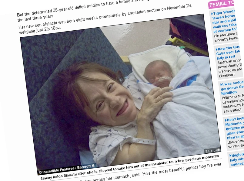 Malachi miał urodzić się tuż przed świętami, ale lekarze zdecydowali, że dalsza ciąża byłaby dla kobiety zbyt niebezpieczna. Stacey porusza się na wózku inwalidzkim. W opiece nad dziećmi pomaga jej Will, mierzący 179 cm. wzrostu aplikant na księdza. Kobieta nazywa go swoim błogosławieństwem. Malachi pozostanie w szpitalnym inkubatorze jeszcze przez kilka miesięcy. „Nie możemy się doczekać chwili, gdy będzie wystarczająco silny, by wrócić do domu” – mówi Stacey.