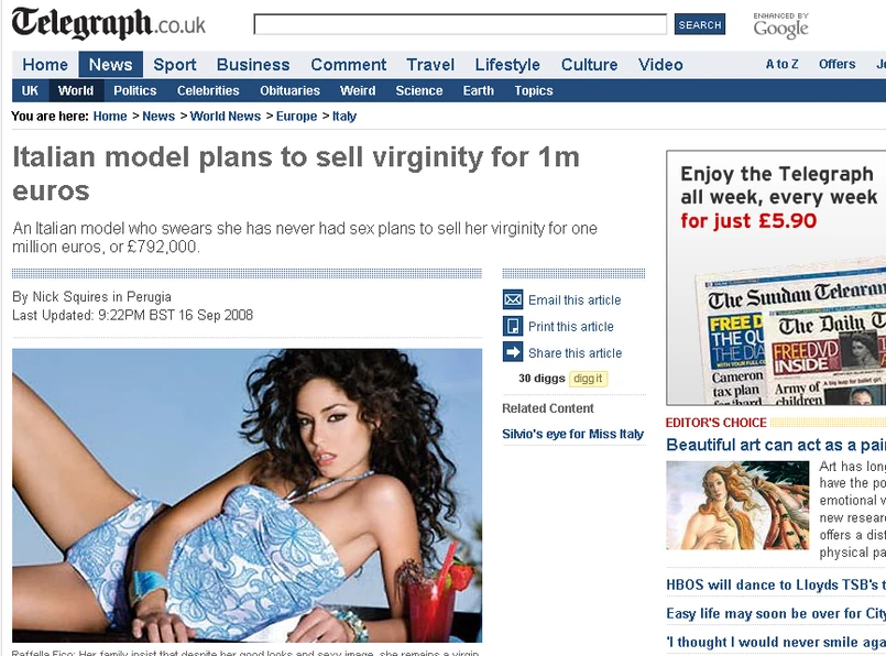 Panna Fico to nie pierwsza kobieta, która postanowiła sprzedać swoją cnotę za duże pieniądze. Niedawno 22-letnia Natalie Dylan z San Diego wyceniła swoje dziewictwo na milion dolarów i wystawiła je na aukcji w jednym z domów publicznych w Nevadzie. Pieniądze chce przeznaczyć na studia magisterskie na kierunku…terapia małżeńska i rodzinna.