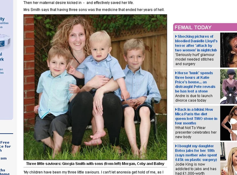 Dwukrotnie przybrała na wadze i udało się - poczęła synka Baileya, dziś siedmiolatka. Po raz pierwszy od lat temat jedzenia witała z pełnym rozluźnieniem. Choroba jednak zaczęła wracać niedługo po narodzinach synka. Jednak obawa przed tym, że nie będzie mgła mieć więcej dzieci, pozwoliła przetrwać najgorsze chwile. Dzięki temu na świecie pojawił się dziś czteroletni Morgan, a w lutym zeszłego roku trzeci syn - Coby.