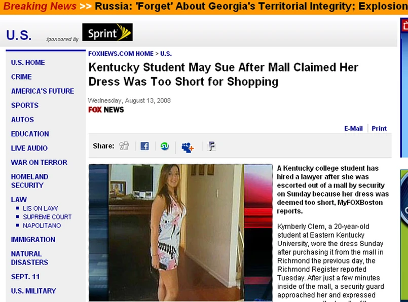 W ubiegłą sobotę Kymberly Clem z Eastern Kentucky University kupiła w centrum handlowym w Richmond sukienkę. W niedzielę wystrojona w nową kreację, znów poszła na zakupy. Do tego samego centrum handlowego. Ku jej zdziwieniu, po kilku minutach podszedł ochroniarz. Nie obawiał się, że może mieć bombę, albo że coś ukradła. Był zaniepokojony długością jej sukienki.