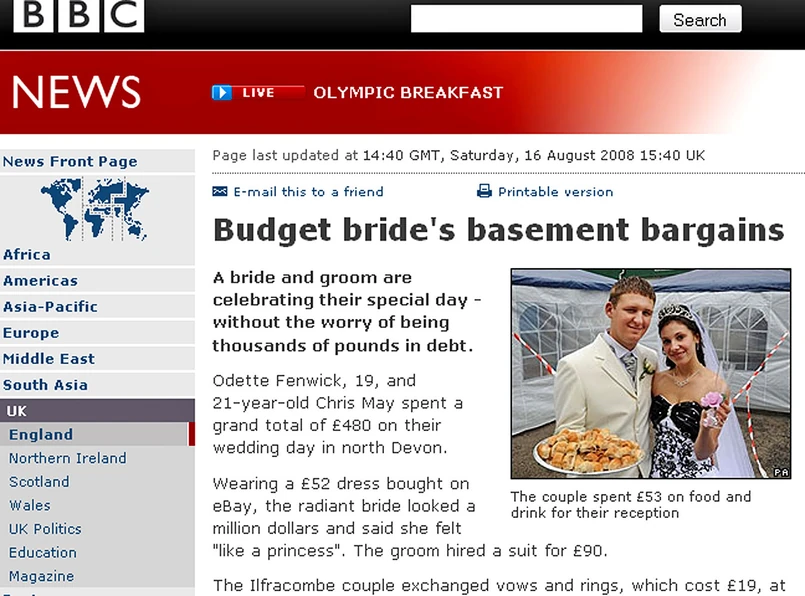 Większość rzeczy pochodziła z aukcji internetowych i lumpeksów. 40 gościom posiłek podano na papierowych talerzykach, a do picia - Chardonnay (89 pensów za butelkę). "Pieniądze nie mają żadnego znaczenia, to po prostu wyjątkowy dzień" - cieszył się 22-letni pan młody Christopher May. Najtańszą ceremonię ślubną na Wyspach, która odbyła się w Barnstaple w Devon, nagrywała telewizja BBC.