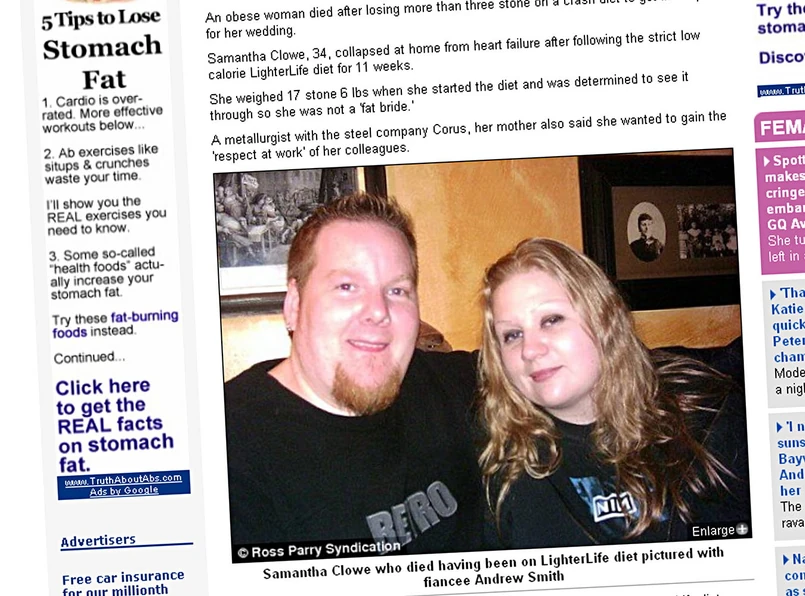 34-letnia Samantha Clowe zawsze była puszysta. Nie chciała jednak w takiej formie wejść na ślubny kobierzec. Zdeterminowana, by nie być "grubą panną młodą", zdecydowała się na bardzo restrykcyjną dietę. Jak mówi matka Samanthy, kobieta, pracująca jako metalurg w przemyśle stalowym, za pomocą odchudzonego wizerunku chciała też zyskać "szacunek w pracy", w oczach swoich współpracowników.