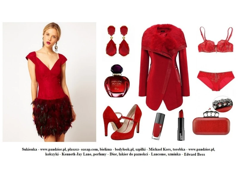 Wybierając się na romantyczną kolację do ekskluzywnej restauracji, załóż więc skąpaną w czerwieni sukienkę. Twój ukochany nie będzie w stanie oderwać od Ciebie wzroku! Doskonałą propozycją wydaje się ta ze sklepu internetowego Pandzior.pl. Wybrana przez nas sukienka składa się z koronkowego topu na grubych rąmiaczkach, z głębokim dekoltem w kształcie litery V, a także z mini spódniczki wykonanej z barwionych na kolor wina piór. Dobierz do niej czerwoną bieliznę, eleganckie czółenka, kopertówkę i efektowne kolczyki. Przed wyjściem koniecznie spryskaj się ulubionymi perfumami!