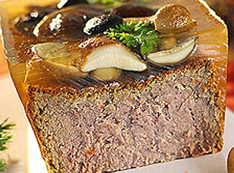Uduś mięso w bulionie z włoszczyzną i przyprawami, a następnie zmiel z bułką 3 razy. Dodaj jajo i przyprawę uniwersalną. Upieczony pasztet odstaw i zrób galaretę: bulion zagotuj z przyprawami. Dodaj rozpuszczoną żelatynę. Pasztet przełóż do większej formy. Udekoruj go grzybami i zalej galaretą.