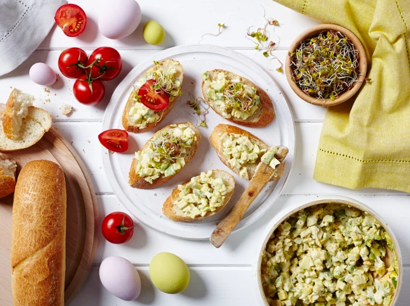 Jajka ugotować na twardo, drobno posiekać. Czosnek przecisnąć przez praskę. Awokado obrać, miąższ pokroić w drobna kostkę, skropić sokiem z cytryny, wymieszać z czosnkiem i jajkami. Doprawić solą morską czosnkową z ziołami Kamis. Dodać majonez, oliwę, wymieszać. Podawać na pieczywie, przystroić kiełkami.