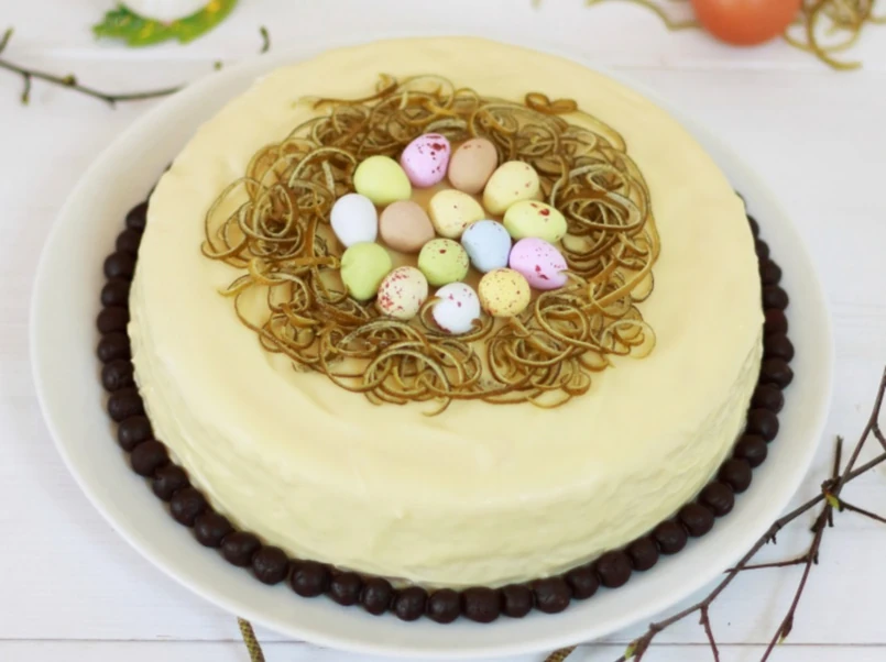 Gotowy sernik udekorować usmażoną skórką z limonki i czekoladowymi jajeczkami.