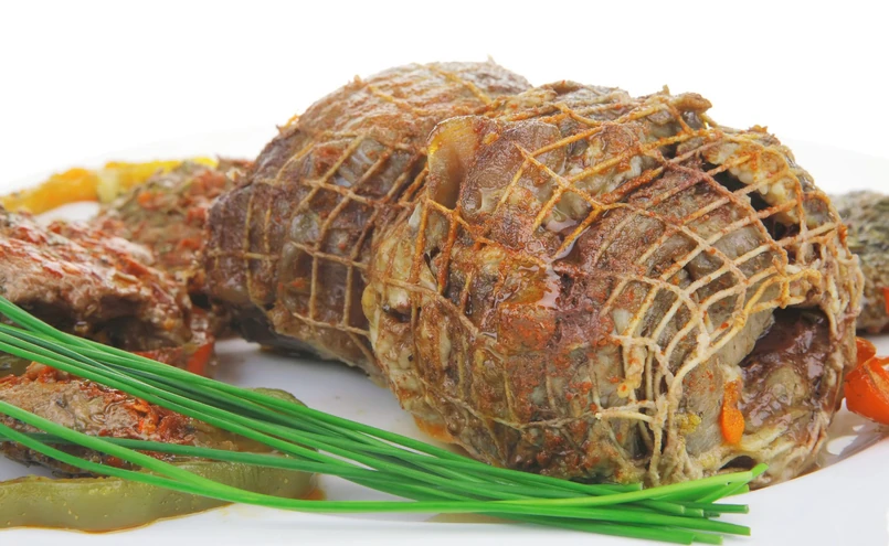Schab przeciąć wzdłuż na grubość ok. 2 cm i rozbić tłuczkiem na grubość 1 – 1 i 1/2 cm, nadając mu kształt prostokąta. Doprawić i posmarować musztardą. Mięso z kurczaka rozbić na cienki płat. Szpinak oczyścić i umyć. Pomidory pokroić. Na rozbity płat schabu rozłożyć listki szpinaku, rozbity filet z kurczaka i pokrojone pomidory. Zwinąć ciasno w rulon, obwiązać nitką, podlać oliwą, zawinąć w folię aluminiową i włożyć do nagrzanego piekarnika. Piec w temp. ok. 180 st. C przez ok. 1 godz. Pod koniec pieczenia zdjąć folię i piec jeszcze przez chwilę do zarumienienia mięsa.