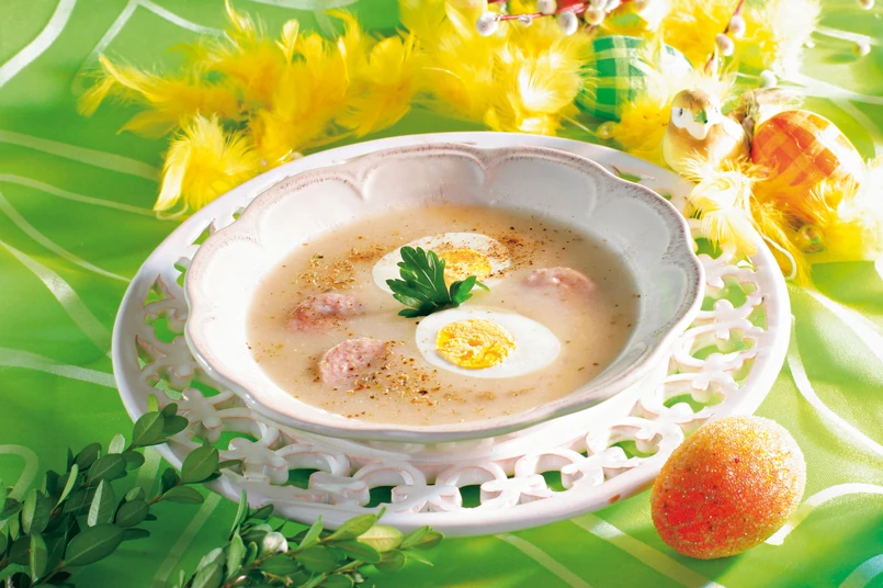 3. Do wywaru wlać zakwas na żur, dodać majeranek, kminek, pieprz, sól, kiełbasę. Żurek zagotować, zdjąć z ognia i połączyć ze śmietaną. Jajka pokroić na cząstki, rozłożyć na talerzach i zalać zupą.